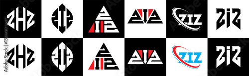 ZIZ letter logo design in six style. ZIZ polygon, circle, triangle, hexagon, flat and simple style with black and white color variation letter logo set in one artboard. ZIZ minimalist and classic logo