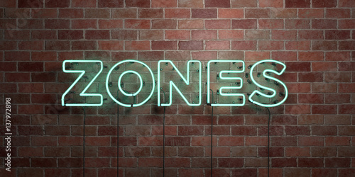 ZONES - fluorescent Neon tube Sign on brickwork - Front view - 3D rendered royalty free stock picture. Can be used for online banner ads and direct mailers..