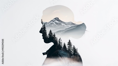Zoologist studying wildlife, double exposure photography blending their image with a futuristic digital interface over a mountain forest landscape, postcard style