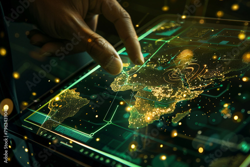 Zoomed-in image of a tablet showing an interactive global economy model, data points highlighted