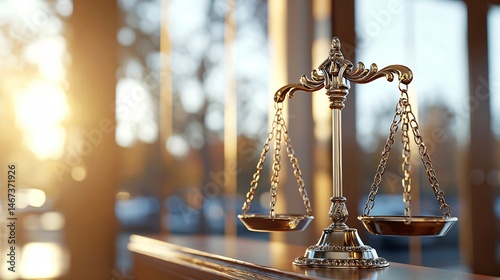 zoomed-in scene of justice scale and gavel, focus on fine detail and material texture, realistic lighting from window side, law firm interior mood