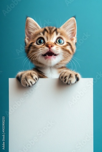 Zoo-style cute setup. Cat mockup urban. Pet ad mockup. Сute cat british shorthair hold in front paws a prototype - large white way sign. Isolated kitty on a solid dress code rblue background.