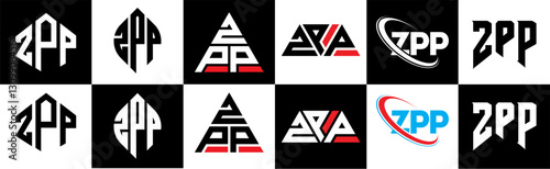 ZPP letter logo design in six style. ZPP polygon, circle, triangle, hexagon, flat and simple style with black and white color variation letter logo set in one artboard. ZPP minimalist and classic logo