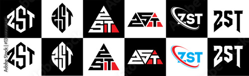 ZST letter logo design in six style. ZST polygon, circle, triangle, hexagon, flat and simple style with black and white color variation letter logo set in one artboard. ZST minimalist and classic logo