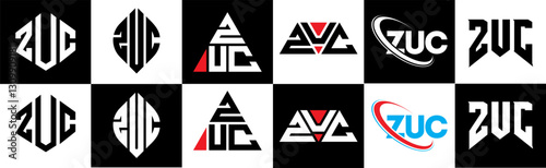 ZUC letter logo design in six style. ZUC polygon, circle, triangle, hexagon, flat and simple style with black and white color variation letter logo set in one artboard. ZUC minimalist and classic logo