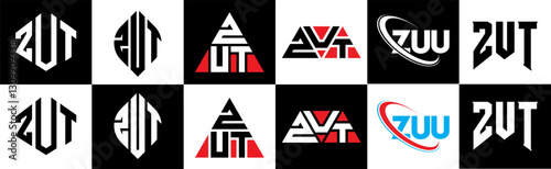 ZUT letter logo design in six style. ZUT polygon, circle, triangle, hexagon, flat and simple style with black and white color variation letter logo set in one artboard. ZUT minimalist and classic logo