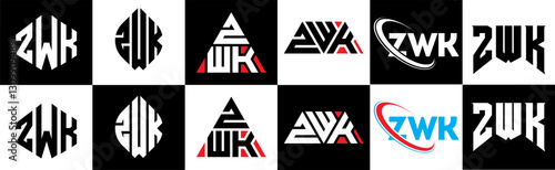 ZWK letter logo design in six style. ZWK polygon, circle, triangle, hexagon, flat and simple style with black and white color variation letter logo set in one artboard. ZWK minimalist and classic logo