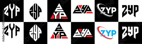 ZYP letter logo design in six style. ZYP polygon, circle, triangle, hexagon, flat and simple style with black and white color variation letter logo set in one artboard. ZYP minimalist and classic logo