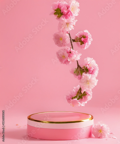 pink podium display. Sakura pink flower falling. Cosmetic or beauty product promotion step floral, pastel pedestal. Abstract minimal advertise.