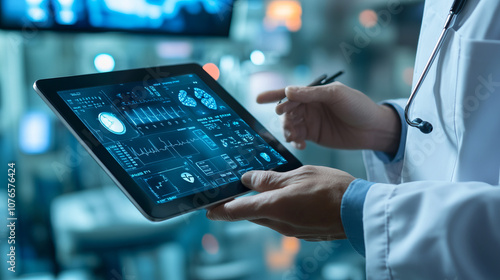 The doctor analyzes the data on the tablet screen with medical images and indicators, which symbolizes modern diagnostics and the use of high technologies in healthcare.