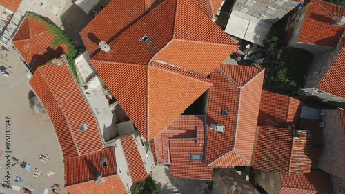 Take off and rising above Budva Montenegro old town with red tile rooftops. Aerial footage.