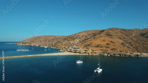 Flying down the hill with luxury white villas, swimming pools surrounded by brown stones, boulders, arid bushes, dusty roads with cars towards Aegean sea coastline. Cyclades. Faros Armenistis, Mykonos