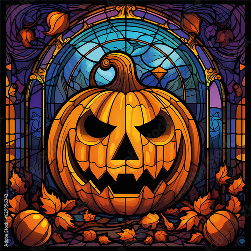 Stained Glass Halloween Scary Pumpkin. Generative AI