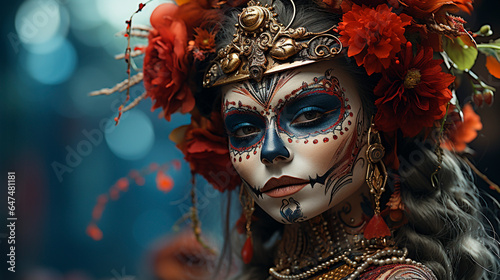 Young woman with braided hair, with catrina makeup and cempasuchil flowers on her head, representing the day of the dead, which is a typical Mexican celebration, celebrated on November 2, generative A
