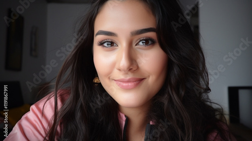 Selfie of a young Latina woman, smiling, with big brown eyes, long brown hair, wearing a pink blouse, generative AI.