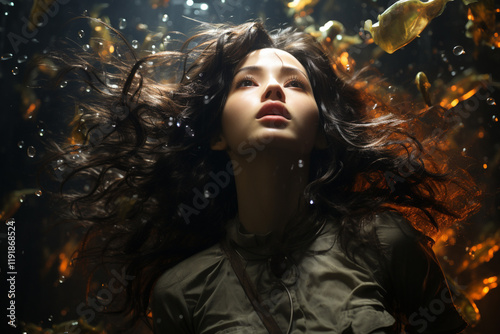 Levitating woman with long, floating black hair, looking up at the night sky, with water drops and orange lights, generative AI