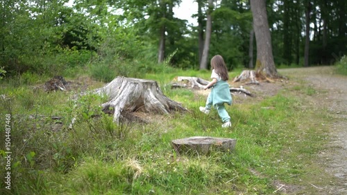 Slow mo video of a little girl playing near an old tree stump in the forest. Concept of childhood in nature