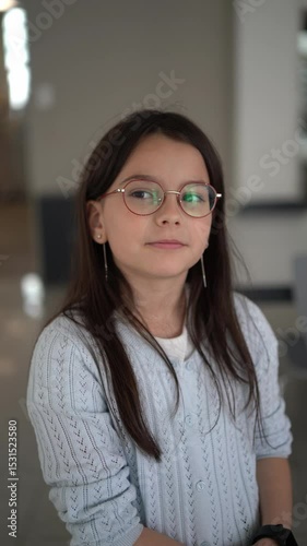 Cute girl in glasses and sweater standing on blurry school background. Educational children's concept