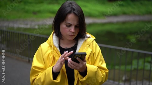 Girl scrolling her phone in the woods, raincoat bright against greenery. Concept: modern lifestyle, tech on the go, contrast of nature and screen time.