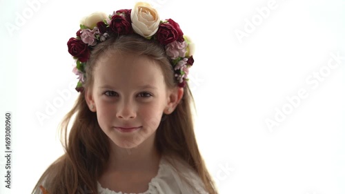 Adorable young girl in a traditional embroidered Ukrainian blouse and floral wreath smiling and blinking in slow motion. Horizontal video capturing innocence, happiness, and cultural heritage with aut