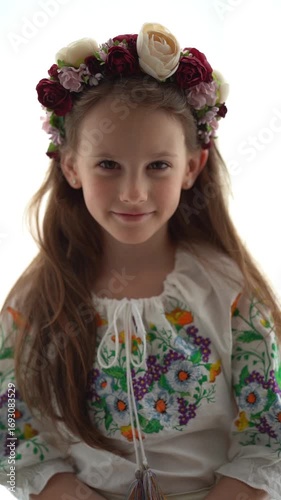 Cute girl in traditional embroidered Ukrainian blouse and floral wreath smiling and blinking. Vertical slow motion video capturing innocence, joy, and cultural heritage