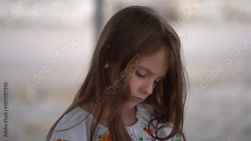 Sad little girl in a traditional embroidered Ukrainian blouse looking down. Emotional horizontal slow motion video symbolizing childhood vulnerability, melancholy, and cultural heritage.