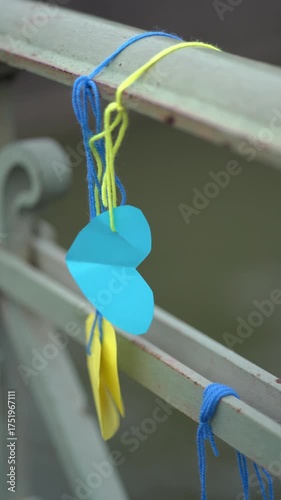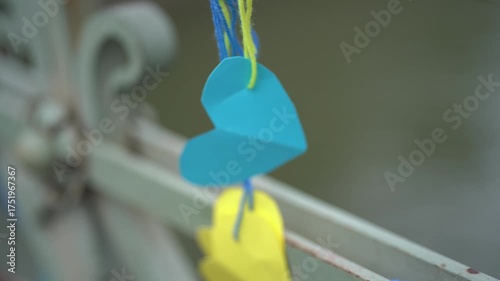 Two paper hearts in yellow and blue colors hang on strings and move in the wind on a bridge. Symbol of Ukraine, national colors, simple handmade decoration outdoors. 4K video, Germany.