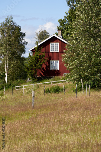 Red Tractor Harvesting Hay in Rural Scandinavian Landscape with Traditional Farm Buildings, Dollar Panels, and Countryside Backdrop Near Håverud, Sweden