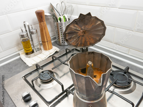 Classic Italian coffee maker with a horizontal white background, located to the right of the photo.