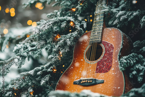 rustic acoustic guitar rests against snow covered pine tree with twinkling lights, evoking sense of cozy winter peace
