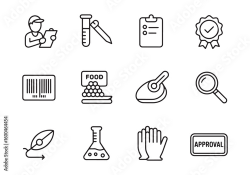 Food safety inspection icons including person with clipboard lab equipment quality seal barcode food item magnifying glass and approval stamp