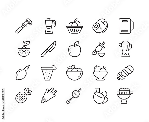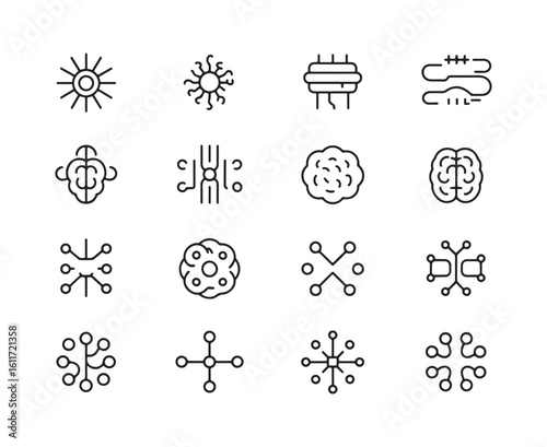 Collection of thin line icons representing abstract concepts and scientific elements science technology