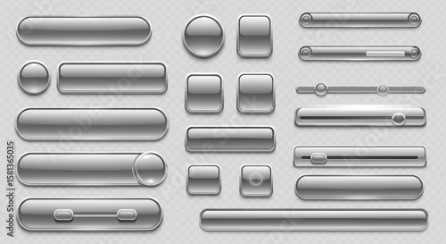 "Set of vector metallic user interface buttons and sliders, glossy chrome and steel textures, futuristic UI/UX components for apps and games — isolated on transparent background"
