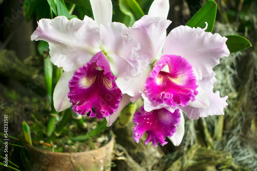 colorful and beautiful Cattleya orchid flowered with large petals and grown in the garden