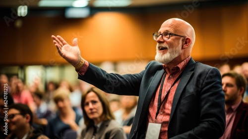 "Conference Success": An impactful photograph capturing the energy and professionalism of a conference or event, featuring a confident speaker engaging with an attentive audience.