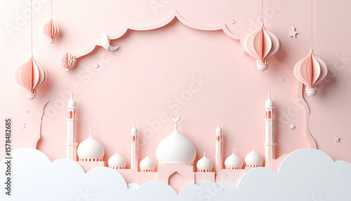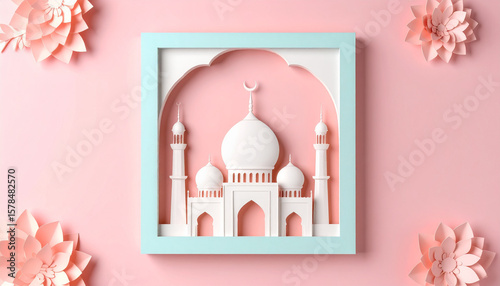 "Flat Lay of Vector Paper Cutout Mosque in Soft Pastel Frame – Modern Islamic Graphic Design with Minimal Aesthetic and Spiritual Symbolism"
