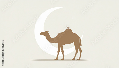"Minimalist Vector-Style Camel Silhouette with Crescent Moon Background – Flat Design Illustration Representing Desert Serenity and Islamic Symbolism"