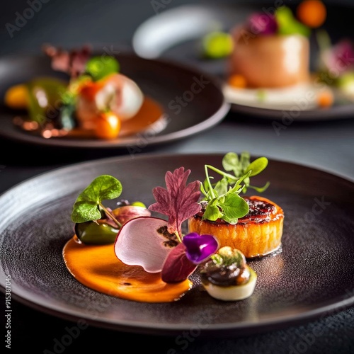 "An aesthetically captivating real picture of gourmet cuisine, showcasing artfully arranged dishes with vibrant colors and intricate details that highlight its culinary elegance