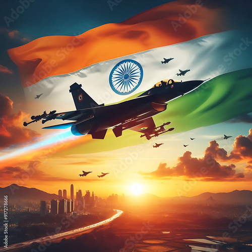 "Indian Air Force Day 2024: Spectacular Jet Air Shows at Sunset with Transparent Indian Flag Tribute on AGUGST 14. generative ai