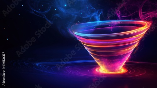 A futuristic funnel shape glowing with neon lights and swirling smoke, set against a dark background. The vibrant lines and patterns create a sense of movement and modern technology.