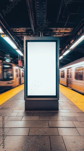 An empty advertisement display in a busy NYC subway station, with a fast-moving train visible in the background, offers a modern, s