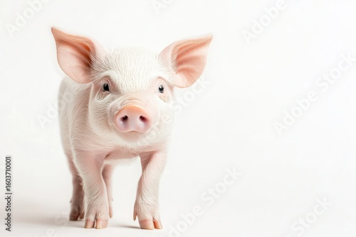 Adorable young piglet with pink ears and snout on white background