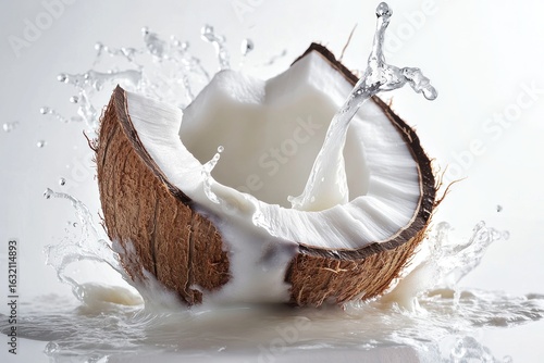 Fresh coconut with milk splash healthy tropical fruit food