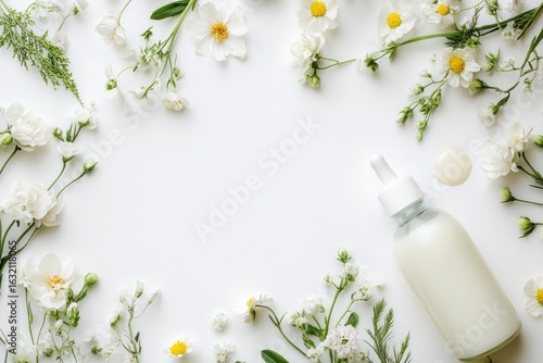 Natural skincare serum bottle with white flowers flat lay photo