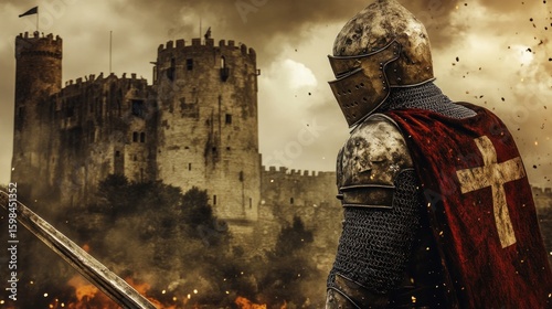 Knight in armor stands guard before a medieval castle under a smoky sky