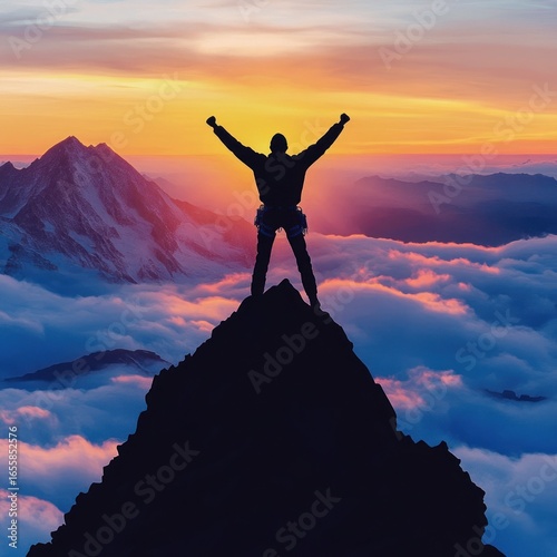 Silhouette of a triumphant person celebrating success on a mountain peak at sunrise