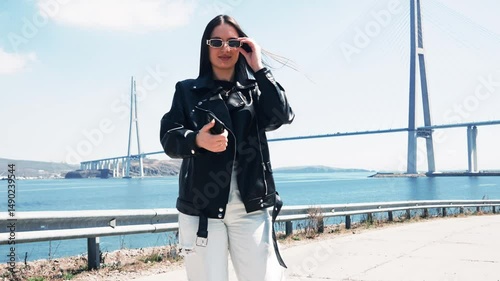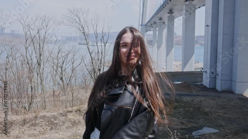 A girl in a leather jacket and fashionable jeans walks along the embankment with a beautiful view of the bridge. She turns her head and lets her hair down beautifully