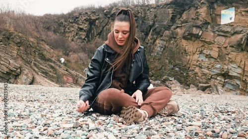 A woman is sitting on a rocky beach, wearing a black jacket and brown pants. She is looking at something in her hand, possibly a rock or a shell. The scene has a calm and peaceful mood