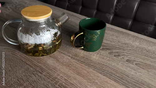 A green tea cup is placed next to a glass teapot filled with a green tea moisture. The teapot has a wooden leg and a spout, while the cup is made of porcelain and has a handle