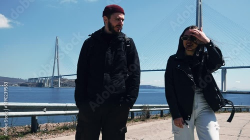 A man and a woman of European appearance are arguing about something in front of the camera. There is a beautiful view of the bridge behind them. People are preparing to record content. The concept of